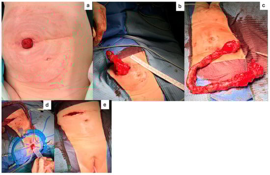 Stoma side incision access and ileoanal pullthrough: (a) ostomy, (b) stoma mobilization; (c) colectomy via stoma side; (d) transanal dissection; (e) before skin closure.