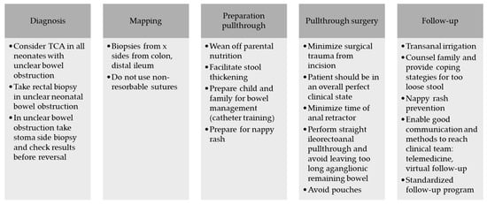 Analyzing our patient cohort operated with the same standard approach within two years allows us to evaluate our pathway of care for TCA. We include pre-pullthrough management, perioperative management, and postoperative follow-up for primary pullthrough.