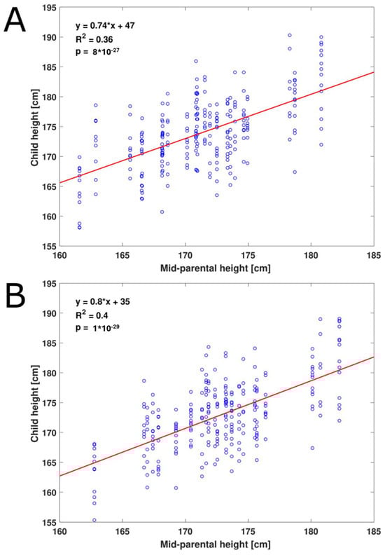 Variance in child height explained by mid-parental height. Each child’s height is plotted against the corresponding mid-parental height. Red line shows the linear fit. (A) Heights are corrected for sex by the standard Tanner procedure (adding 13 cm to female heights) and are not corrected for age. (B) Heights are first corrected for parental age and then corrected for sex by a multiplication factor.