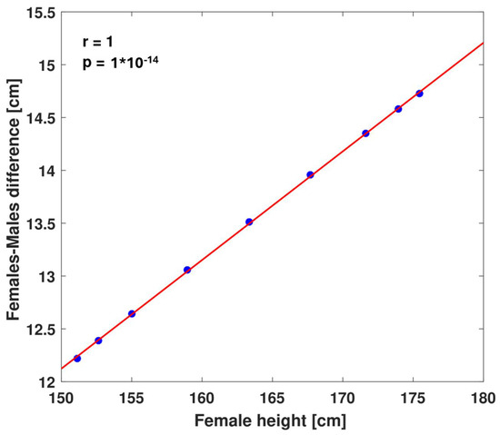 The Tanner procedure is based on the assumption of a constant average 13 cm difference between female and male heights at the same percentile, independent of the actual percentile. To test whether this is the case, we investigated the height differences between adult males and females at the same percentile in the CDC growth charts (we used height at age 20, the final entry in the CDC growth charts) [11]. We found that the difference between males and females is not constant but rather is linearly dependent on height (R2 = 1, Figure 2).