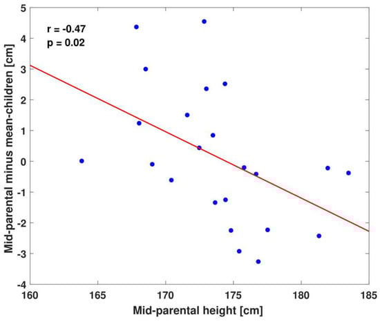 To assess the effect of regression to the mean on height prediction, we calculated the difference between the mean height of children in each nuclear family and their mid-parental height. As expected, we observed a negative correlation (r = −0.47, p = 0.02, Figure 3). For standardized heights, we observed the following relationship: Corrected Height = 0.79 × (mid-parental standardized height) − 0.077 (Table 1).