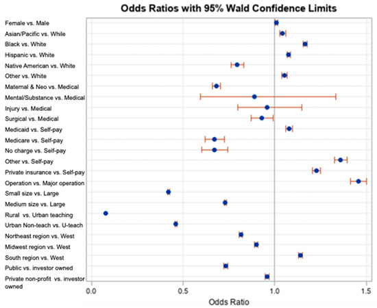 Regarding payment source, significance was associated with NBSIs when compared to “Self-pay” (p < 0.0001), where Medicare (OR = 0.668; 95% CI: 0.619–0.720) showed 33.2% lower odds of infection. No charge (OR = 0.579; 95% CI: 0.523–0.640) also showed a 42.1% lower odds of infection when compared to Self-pay, whereas Private Insurance (OR = 1.526; 95% CI: 1.501–1.551), Medicaid (OR = 1.305; 95% CI: 1.283–1.326), and Other (OR = 1.577; 95% CI: 1.539–1.617) all showed higher odds of infection (52.6%, 30.5%, 57.7%, respectively) when compared to the odds of infection of Self-pay patients.