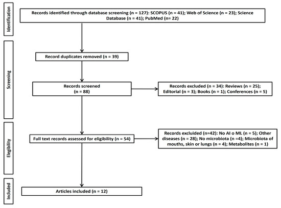 The following search terms with relevant Boolean operators (including wildcards) were used: (gut* OR intestine* OR bowel* OR gastrointestinal*) AND (microbiota* OR microflora* OR bacteria* OR microbiome* OR flora* OR bacterial* OR bacteria* OR microorganism* OR feces* OR stool*) AND (‘Autism’ OR ‘ASD’ OR ‘autism spectrum disorder’) AND (‘Artificial Intelligence’ OR ‘Machine Learning’). Furthermore, Web of Science was searched according to ‘theme’, whilst Scopus was searched according to ‘title, abstract and keywords’, PubMed according to ‘all fields’ and finally, Science according to ‘all fields except full text (NOFT)’. No language restriction was applied to any of the searches.