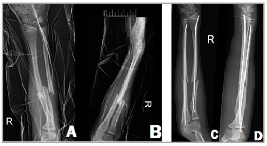 X-ray images of a 13-year-old girl’s right forearm from anteroposterior (A) and lateral (B) views before surgery, showing the complete fractures of the radius and ulna. After the surgery (C,D), the two TENs fixate the fracture in a good position.