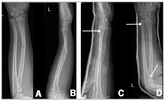 The titanium elastic nail to be inserted into the ulna is most commonly from the proximal end of the bone, while the insertion of the radial intramedullary nail is carried out from the distal end of the radial side. The minimally bent tip of these implants makes reduction easier. Insertion is performed under the control of intraoperative imaging with C-arm fluoroscopy. Regarding the length and the diameter of the implant, it can be stated that it is recommended to insert a nail that fills two-thirds of the medullary canal. The usage of a thinner nail can lead to the instability of the reduction and delayed fracture healing [17,18]. First, we have to attempt the closed reduction of the fracture, but if this is unsuccessful, we can perform a percutaneous reduction of the fracture with a guide wire inserted into the fracture site [19]. Once the desired position is achieved, we insert the elastic nails into both the radius and the ulna (Figure 1). In children operated with ESIN, there is usually no need for plaster immobilization and their emission from the hospital can take place on the first or second postoperative day.