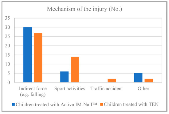 Based on the data from the study’s examined children, it can be affirmed that no statistically significant difference was found (p = 0.139) regarding the mechanism of the injury. Approximately three-quarters (73%) of the resorbable group and nearly two-thirds (60%) of the TEN group sustained injuries due to indirect force, such as a fall. Injuries during sports activities also suggest the possibility of indirect force in some cases. Forearm fractures resulting from high-energy accidents occurred in a smaller number of cases (Figure 3).