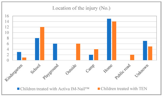 Observing the location of the injuries, it can be noted that most forearm fractures occurred at home (31.11% in the TEN group and 36.59% in the resorbable group), while the number of fractures occurring at school (26.67%) is approaching this figure among the children treated with TEN (Figure 4). There is a significant difference between playground and outdoor hued by implant type with a corrected p-value of 0.0218. The analysis with Fisher’s Exact Test and Holm–Bonferroni correction found a significant difference between the subgroups for injury place.