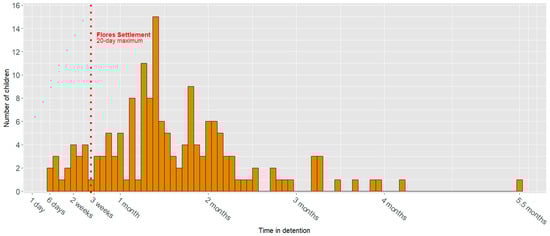Furthermore, migrant children are not only detained, but are also forced to endure precarious living conditions in the detention centers for prolonged periods of time, in direct violation of the national minimum standards for the treatment and timely release of detained immigrant children as established by the Flores Settlement Agreement (FSA). The FSA was reached in 1997 in response to the government’s mistreatment of children in immigration detention and set the basic standard for children in US immigration custody, including a mandate that children are detained for the shortest period of time; no longer than 72 h in CBP custody and no longer than 20 days in ICE custody as well as access to sanitation, food, supervision, and medical assistance [13]. However, data has shown that more than one-third of children held, were in ICE custody for more than 72 h between 2017 and 2021 [12]. In 2015, the Flores settlement agreement was expanded to bring child welfare protection to accompanied children in detention centers as well. However, despite the Flores ruling, existing data show that detained migrant children are often held in overcrowded and unsanitary living conditions for extended periods of time [3,6], and receive sub-par medical care [3,4]; evidence of a grave lack of fundamental protections owed to children.
