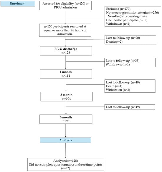Eligible participants included parents of children aged 1 month to 18 years who were admitted to the PICU for a minimum of 48 h to ensure adequate exposure to the PICU environment and receive support for at least one organ. Parents of children who were under a do-not-resuscitate order at the time of admission were excluded from the study (Figure 1). To detect a 0.3 effect size difference in the Pediatric Quality of Life (PedsQL™) scores from PICU admission to six months post-discharge, a sample size of 110 was initially determined sufficient. However, a notable attrition rate of 40% (12/30) at the three-month follow-up prompted an ethical approval request to increase the recruitment target to 150 children, thereby ensuring adequate power for the six-month evaluations.