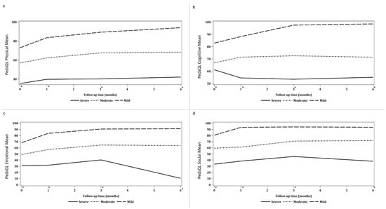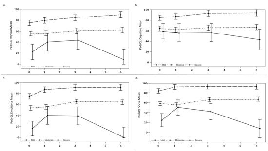 Mixed model analysis of differences in physical, cognitive, emotional, and social health, adjusted for child’s age and household income across PICU discharge, 1-, 3-, and 6-months after PICU discharge, across three groups (mild, moderate, severe). (a) PedsQL Physical Mean, (b) PedsQL Cognitive Mean, (c) PedsQL Emotional Mean, (d) PedsQL SocialMean.
