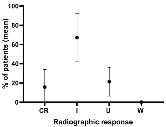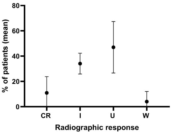 In four retrospective studies involving 128 patients, the postoperative outcomes of the syrinx were analyzed over an average follow-up period of 3.6 years. Radiographic results indicated that although significant improvement in syrinx index occurred in a wide range of variations, approximately 25% to 63% or 87.5%, 12.5% or 37% up to 75% showed no change, yet satisfactory clinical outcomes were reported. Statistically significant differences were observed between preoperative and postoperative syrinx measurements (p < 0.05) [23], despite the lack of a radiographic change in syrinx size ranging between 28% and 75% in the literature [2,20,21,23]. Averaging all results showed that 45 ± 21.1%, 47 ± 20.4%, and 4.0 ± 8% of patients achieved complete resolution/improvement, no change, and worsened syrinx indices, respectively (Figure 2) [2,20,21,23]. Despite the variability in results, significant clinical improvement is frequently observed postoperatively. However, changes in syrinx size do not consistently correlate with clinical outcomes, emphasizing the need for careful postoperative monitoring.