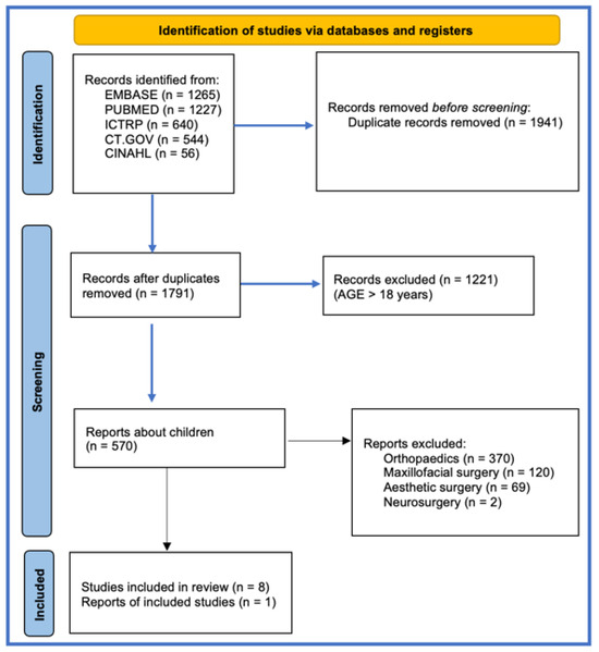 We conducted a systematic literature review of PubMed, Embase, ICTRP, ClinicalTrials.gov, CINAHL, and Scopus in February 2024, following the Preferred Reporting Items for Systematic Reviews and Meta-Analysis (PRISMA) guidelines (Figure 1). The search was performed using the term “platelet-rich plasma” in all fields. We included papers published between January 2004 and January 2024. The research criteria were limited to children, English language, and studies involving human subjects. All titles and abstracts retrieved from the initial search were independently evaluated for relevance by two reviewers. Studies deemed relevant underwent full-text review. All stages of the review process, including screening, selection, and data extraction, were conducted independently by two reviewers. Any discrepancies were resolved through discussion and consensus.