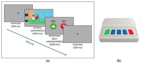The stimuli were presented electronically using E-Prime 3.0 software [36], and for the response, the USB response device Chronos [37] was used. This was adapted so that the two outside buttons could be used for yes and no (Figure 1b).