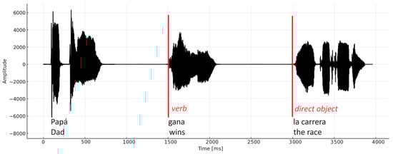 Using BrainVision Analyzer software version 2.3, the recorded data were pre-processed according to standard practices. Data were filtered using an 8th-order Butterworth bandpass filter, with cut-off frequencies of 0.1 Hz and 30 Hz. Artifacts were rejected by visual inspection from an expert. Both verb and direct object ERP were obtained. Stimulus phrases were designed so that the verb segment and the direct object segment started at specific times, as shown in the example in Figure 2.