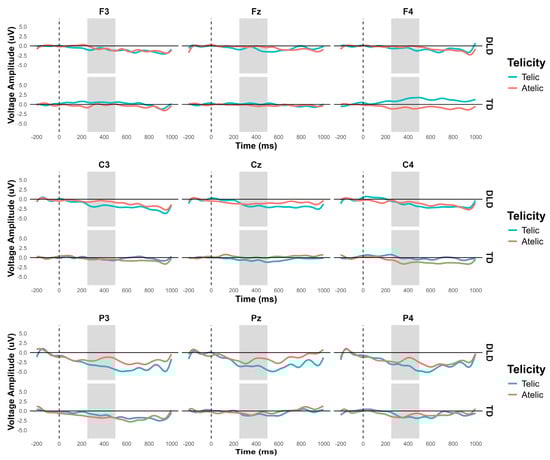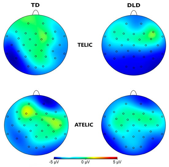 The general ANOVA in the time window of 250 to 500 ms revealed a significant interaction between group and telicity—F (1354) = 4.705, p = 0.030—where children with DLD showed a more negative amplitude in the telic condition compared to TD children (see Figure 3 and Figure 4). Specifically, comparisons between the DLD and TD groups showed significant differences in both the telic and atelic conditions. For telic conditions, the difference between the TD and DLD groups was M = 1.307, SE = 0.19, t (3596) = 6.881, p < 0.001. For atelic conditions, the difference was M = 0.733, SE = 0.19, t (3596) = 3.859, p < 0.001. Within the DLD group, there was a significant contrast between atelic and telic conditions, where the telic condition showed a more negative amplitude than the atelic, with a contrast estimate of M = 0.712, SE = 0.19, t (3596) = 3.748, p < 0.001. No significant contrast was found within the TD group: M = 0.712, SE = 0.19, t (3596) = 0.727, p = 0.467.