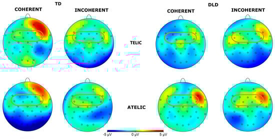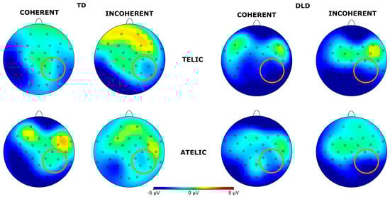 In the subsequent window of 600 to 1000 ms, our analysis revealed a significant interaction between group, telicity, coherence, and hemisphere. For telic–coherent and –incoherent sentences, children with DLD detect the effect of telicity later than their TD peers. These results are consistent with the hypothesis that children with DLD will show a delayed effect in response to incoherent sentences [29]. In this case, the effects were detected in a later time window. On the other hand, the TD group seems to engage in a review of the coherence of atelic sentences, resulting in increased negativity. This suggests that, at this stage, TD children are re-evaluating whether the sentence accurately describes an event that occurred, contributing to a higher cognitive cost. Children with DLD, however, do not appear to be performing this re-evaluation, indicating potential difficulties in their ability to reassess sentence coherence.
