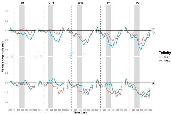 The general ANOVA in the time window of 250 to 500 ms showed a significant interaction between group and telicity: F (13,728) = 13.504, p < 0.001. As mentioned previously, we focus on the right centroparietal ROI composed of electrodes C4, CP2, CP6, P4, and P8: F (1, 752) = 9.702, p < 0.001. The contrast in this region shows that, in the telic condition, children with DLD showed a more negative amplitude than TD children: M = −1.184, SE = 0.409, t (756) = −2.899, p < 0.001. In the atelic condition, the difference was not significant: M = 0.614, SE = 0.409, t (756) = 1.503, p = 0.133. Intragroup contrasts for the DLD group showed a more negative amplitude in the telic condition than the atelic condition: M = 1.010, SE = 0.409, t (756) = 2.472, p = 0.014. For the TD group, the difference between telic and atelic conditions was marginally significant, showing a more negative trend in the atelic condition compared to the telic condition: M = −0.789, SE = 0.409, t (756) = −1.931, p = 0.054 (see Figure 7). The ERP waveforms highlight the significant differences observed, particularly in the telic condition between groups.