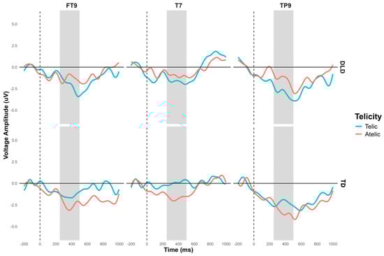 According to the proposed hypothesis, we expected to find difficulties in children with DLD in distinguishing atelic verbs in contrast to telic verbs through an attenuation of the N400 for incoherent atelic sentences. These assumptions were based on findings in English- and German-speaking speaking populations, where atelic verbs are processed later and with greater difficulty than telic verbs [20,23].
