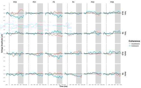 The general ANOVA in the time window of 600 to 1000 ms revealed a significant interaction between group, telicity, coherence, and hemisphere: F (13,728) = 6.525, p = 0.0107. When we focus on the frontal ROI conformed by F3, FC1, FC5, F4, FC2, and FC6 (F (1, 896) = 5.127, p = 0.024) the intergroup contrasts indicate significant differences in several conditions. For telic–coherent sentences in the left hemisphere, children with DLD show a more negative amplitude than TD children: M = −1.969, SE = 0.814, t (896) = −2.419, p = 0.016. In telic–incoherent sentences in the left hemisphere, the difference is marginally significant: M = 1.455, SE = 0.814, t (896) = 1.787, p = 0.074. For atelic–incoherent sentences in the right hemisphere, the difference is also significant (M = 1.631, SE = 0.814, t (896) = 2.004, p = 0.045), showing a more negative trend in the TD group. The intragroup contrasts for the DLD group showed significant differences between the telic–coherent and telic–incoherent conditions in the left hemisphere (M = −2.3834, SE = 0.814, t (896) = −2.928, p = 0.018), showing a more negative amplitude in the telic–coherent condition. No significant differences were found in the TD group. The ERP waveforms illustrate these differences, particularly highlighting the interaction effects observed across hemispheres and conditions (see Figure 10 and Figure 11). Similar effects were found with a more frontal distribution in studies involving similar semantic tasks, focusing specifically on object–verb manipulation in the Spanish language [40].
