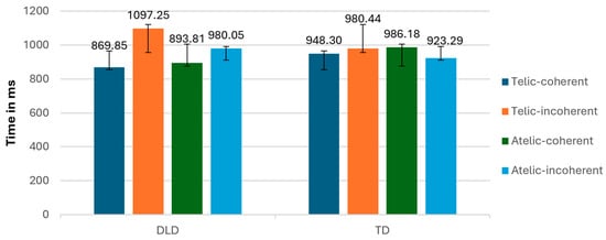 At the intragroup level, the DLD group showed longer reaction times for incoherent conditions compared to coherent conditions, indicating greater difficulty or slower processing when the information presented was not coherent. In contrast, the TD group exhibited faster reaction times overall, with less pronounced differences between coherent and incoherent conditions, suggesting more efficient processing and better ability to handle both coherent and incoherent information.