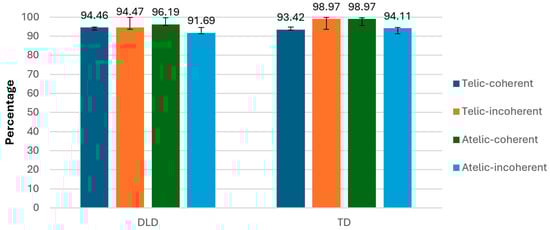Currently, research on telicity in Spanish-speaking children with DLD is limited, as we found only one significant study on this topic related to speech production. In this regard, Grinstead et al. [24] analyzed the spontaneous speech of 38 Mexican children (19 with DLD and 19 typically developing) with a mean age of 6 years. Their findings revealed a general preference in both groups for the use of telic verbs in the past tense and atelic verbs in the present tense, a pattern consistent with what has been observed in other languages [25,26]. While children with DLD produced fewer verbs overall than their typically developing peers, no significant differences were found in the use of lexical aspect between the groups.