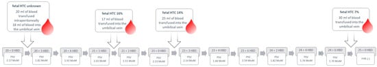 Each cordocentesis procedure was performed by a specialist in maternal-fetal medicine. The primary objective in every case was to puncture the umbilical vein (either at the free loop or cord insertion) to obtain a blood sample for a complete blood count and administer rocuronium based on the estimated fetal body weight. Subsequently, blood transfusion was initiated without removing the needle from the vessel. In instances where umbilical vein puncture was technically unfeasible, blood was administered intraperitoneally. The volume of blood transfused was adjusted according to the severity of anemia, calculated using the donor hematocrit (75%), initial fetal hematocrit, final fetal hematocrit (~45%), and estimated fetal weight.