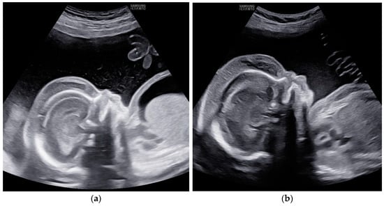 Case 4: Edema of fetal subcutaneous tissue; no signs of resolution of hydrops; (a) before first intrauterine transfusion, 20 weeks of gestational age; (b) after third intrauterine transfusion, 24 weeks of gestational age.