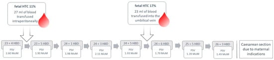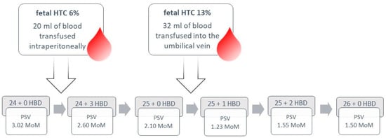 Subsequent ultrasound examinations were conducted in the ensuing weeks. At 27 weeks of pregnancy, the peak systolic velocity (PSV) of the middle cerebral artery (MCA) measured 58.31 cm/s (1.66 MoM), which decreased to 55.00 cm/s (1.49 MoM) by 28 weeks of gestation. Doppler results and the timing of the intrauterine transfusions are illustrated in Figure 5.