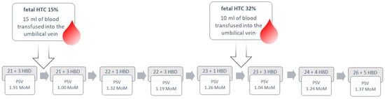 The patient was discharged from the hospital in good general condition, with a PSV MCA of 39.00 cm/s (1.24 MoM) recorded on the day of discharge. Fetal hydrops showed signs of improvement, with only a minimal amount of fluid observed in the fetal abdominal cavity. Doppler results and the timing of intrauterine transfusions are illustrated in Figure 8.