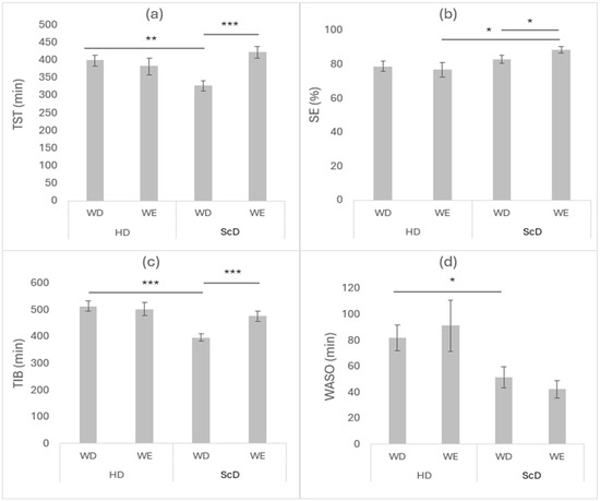 Figure 1. Mean ± standard error of (a) TST, (b) SE, (c) TIB, and (d) WASO on weekdays and weekends during holidays and schooldays. Abbreviations: HD = holidays, ScD = schooldays, SE = sleep efficiency, TST = total sleep time, WD = weekdays, WE = weekend. * p < 0.05 ** p < 0.01, and *** p < 0.001.