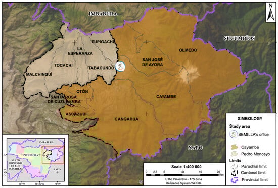 The study area includes two specific cantons in the Pichincha province—Cayambe and Pedro Moncayo—which are located approximately 90 km northeast of the capital city of Quito in the northern highlands region of the country (Figure 1). The total population in the study area is estimated at approximately 118,967 inhabitants [25] and mainly concentrated in the Cayambe canton (72%), where 54.5% reside in rural areas [26]. In Pedro Moncayo, the percentage of rural inhabitants is higher (70%) [27]. This region was selected for several reasons: (1) this region has seen a dramatic increase over the past decade in greenhouse cut flower production and concentrate about half of the country’s flower production [28,29]; (2) the flower industry employs a large female labor force, mainly of reproductive age; and (3) this region was the focus of previous studies that inform the aims of SEMILLA [18,19,20,21,22].