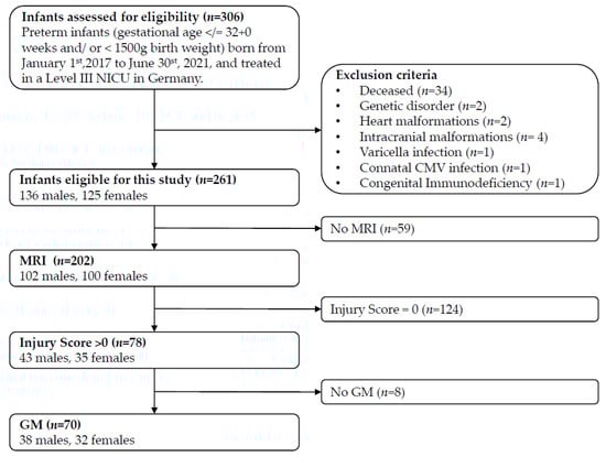 From 1 January 2017, to 30 June 2021, 306 VPTs with ≤32 + 0 weeks gestation and/or <1500 g birth weight were born in a level-three NICU. Among these infants, 261 VPTs (85.3%) were eligible for this retrospective study. A cMRI at TEA was performed in 202 (77.0%) VPTs with 78 (38.6%) showing any grade of brain injury. The final cohort comprised of 70 VPTs, as eight VPTs had no GM analysis. Figure 1 shows the patient flow that determined the final sample size for this study.