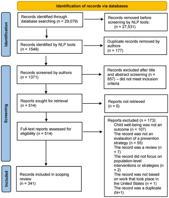 A total of 29,079 records were identified using the search terms and parameters identified in Table 1. The NLP tools flagged 1548 articles for inclusion based on inclusion and exclusion criteria. Inclusion criteria included the following: (1) published between January 2013 and November 2023; (2) written in English; (3) conducted in the United States; (4) the record focused on population-level interventions or strategies; (5) the record was an evaluation; and (6) child well-being was an outcome. Exclusion criteria included the following: (1) the record was a review or commentary; (2) prevention or intervention focused exclusively on individual-level behavior change; or (3) the record focused on international work. Rigorous evaluation was not a criterion for inclusion, and not all prevention strategies identified have been rigorously evaluated. These titles and abstracts were then reviewed by two co-authors to determine if they truly met inclusion criteria. Duplicate records were removed (n = 177). Following the title and abstract review, 857 records were excluded for not meeting the inclusion criteria.