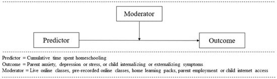 Conceptual Model for Ordinary Least Squares Regression. Note. This conceptual model demonstrates the intention of the ordinary least squares regressions to determine whether the relationship between cumulative time spent homeschooling and the mental health outcome is changed by the moderator. This image is based on models from Moon [68] and Hayes [66].