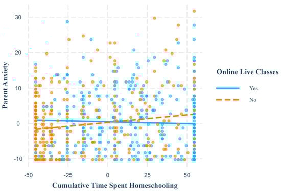 Simple slopes for parent anxiety outcome, online live classes moderator. Note. This plot shows the relationship between cumulative time spent homeschooling and parent anxiety at different levels of the moderator, online live classes. The relationship was significant and positive when children did not receive online classes but was non-significant when they did. Axis numerical ranges reflect grand mean centering or effect coding of variables.