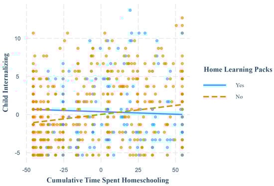Simple slopes for child internalizing outcome, home learning pack moderator. Note. This plot shows the relationship between cumulative time spent homeschooling and child internalizing symptoms at different levels of the moderator, home learning packs. The relationship was significant and positive when children did not receive online classes but was non-significant when they did. Axis numerical ranges reflect grand mean centering or effect coding of variables.