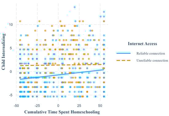 Ordinary least squares regressions revealed that internet connection interacted with cumulative time spent homeschooling to predict child internalizing symptoms (Table 6). Simple slopes revealed that cumulative time spent homeschooling was significantly positively associated with child internalizing symptoms when children had access to reliable internet connection, but not when they had unreliable internet connection (Table 5; Figure 4).