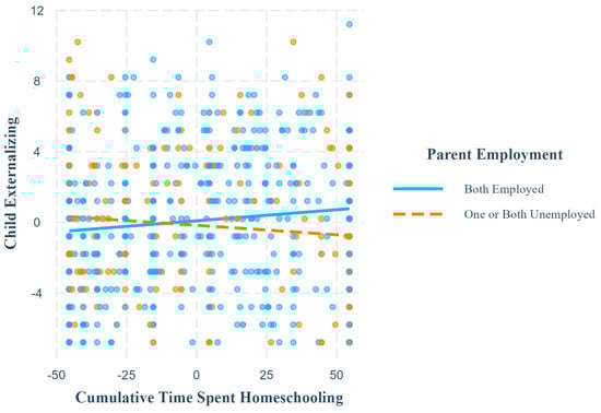 Many parents either lost their jobs during the COVID-19 pandemic or reduced their working hours to care for their children [45]. Findings are mixed regarding the effects of parent employment on family mental health during COVID-19. Pre-pandemic research has linked self- or spousal unemployment to stress, anxiety and depression in adults [23,46,47]. Some pre-pandemic studies have linked parental unemployment to poorer mental health outcomes for children due to family financial strain and reduced parental well-being [24], while others have found beneficial impacts on younger children due to increased availability of parent–child quality time [48]. In line with many pre-pandemic findings, parent unemployment during the pandemic has been associated with increased depression in parents [5] and increased negative affect in children [49]. Employed parents, however, reported that balancing the responsibility of their child’s education with work was a major source of stress, and many felt unable to provide their child with adequate school support [4,7,22]. These findings prompted us to explore parent employment status as a factor that may have influenced family mental health during mandatory homeschooling.