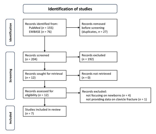 - Ahn, E.S.; Jung, M.S.; Lee, Y.K.; Ko, S.Y.; Shin, S.M.; Hahn, M.H. Neonatal Clavicular Fracture: Recent 10 Year Study. Pediatr. Int. 2015, 57, 60–63. [Google Scholar] [CrossRef] [PubMed]