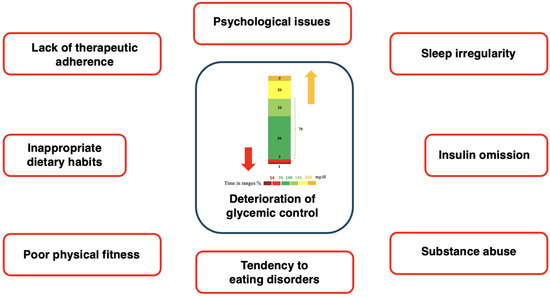 Eating disorders also affect metabolic control in adolescents with T1D. Disordered eating behaviors, such as an unbalanced and irregular diet or the practice of skipping or reducing insulin doses to control weight, are associated with higher HbA1c levels [21]. This practice, known as diabulimia, is linked to short- and long-term complications, including abnormal lipid profiles, diabetic ketoacidosis, retinopathy, neuropathy, nephropathy, and even higher mortality rates [58].