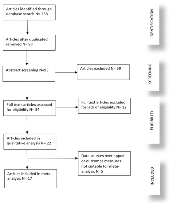 The initial search yielded a total of 238 articles from PubMed, Scopus, and Web of Science. After duplicates were removed, 93 articles remained. Screening titles and abstracts excluded 59 articles that did not meet the inclusion criteria, primarily due to irrelevance to the maternal factors or child oral health outcomes. The full texts of the remaining 34 articles were assessed for eligibility, resulting in 22 studies being included in the qualitative analysis. Studies (12) were excluded from the qualitative analysis based on our predefined inclusion and exclusion criteria. Of these, 11 studies did not specifically address the relationship between maternal nutrition or lifestyle factors and childhood dental caries outcomes. One study was published in a language other than English, preventing its inclusion in our review. Subsequently, five studies were excluded from quantitative synthesis (meta-analysis) because the outcome measures were not suitable for meta-analysis (3) and data sources overlapped (2). The process of study selection is summarized in a PRISMA flow diagram, as shown in Figure 1.