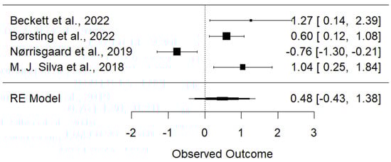The Newcastle–Ottawa Scale (NOS) scores ranged from 6 to 9 for cohort and randomized trial studies and 6 to 8 for cross-sectional studies. The majority of studies scored between 7 and 8, indicating generally good methodological quality. Randomized trials, such as those by Børsting et al. (2022) and Nørrisgaard et al. (2019), received the highest scores of 9/9, reflecting their strong design and execution. Prospective cohort studies scored slightly higher than retrospective cohorts, achieving 7–8/9. Cross-sectional studies generally received the lowest scores, ranging from 6/9 to 7/9. The most common areas where studies lost points were in the selection and comparability domains, while most studies scored well in the outcome assessment domain. Overall, the NOS scores suggest that the majority of the studies included in this analysis were of high methodological quality, with some variation based on study design and specific methodological strengths and limitations.