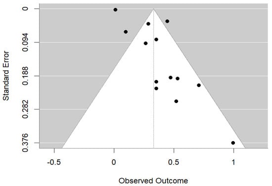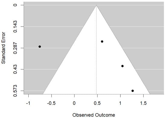 The meta-analysis evaluated the association between maternal vitamin D levels and dental health outcomes in offspring, revealing a significant overall association (OR = 1.30, 95% CI: 0.49 to 3.45, p < 0.001) (Figure 2). The analysis showed substantial heterogeneity (Q = 21.815, I2 = 86.2%, p < 0.001), indicating variability among the studies. Separate analysis of cohort studies found a statistically significant overall effect (OR = 1.1187, 95% CI: 0.4680–1.7694 p < 0.001). There was no observed heterogeneity among the cohort studies (I2 = 0.00%), as confirmed by a non-significant Q test = 0.1007, p = 0.7510. This suggests that the effect is consistent across the studies and the observed effect is robust. Randomized trials supported the beneficial effect of vitamin D supplementation during pregnancy on reducing enamel defects. However, the high heterogeneity suggests diverse results, likely due to differences in study designs, populations, and methods. The funnel plot (Figure 3) suggests some potential asymmetry in the data, but the small number of studies limited the strength of any conclusions about publication bias.