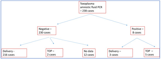 In 230 of the 238 cases, the presence of Toxoplasma DNA in the amniotic fluid was not detected by PCR. TOP was chosen in only two of these cases (0.8%). We were able to detect Toxoplasma DNA in the amniotic fluid in a total of eight cases, and TOP occurred in five of these cases (62%).