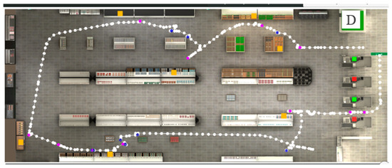 Picture showing the trajectory (path) of a participant during performance of the VAP-S. The departure of the path is indicated with the letter D. White dots correspond to the participant’s recorded positions. The orange squares represent the places where products appear on the shopping list. The purple dots represent participants’ stops. The blue dots represent collisions made by the participant. The green squares represent checkout counters with a cashier present. The red squares represent checkout counters without a cashier.