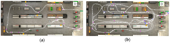 Trajectory (successive white dots) of participants during VAP-S performance. The departure of the path is indicated with the letter D. The orange squares represent the products, blue dots represent the collisions, and purple dots represent the stops. (a) Trajectory of a typical hearing child; (b) trajectory of a D/HH child. The green squares represent checkout counters with a cashier present. The red squares represent checkout counters without a cashier.