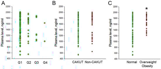 Comparison of plasma lactoferrin concentrations between (A) the CKD stages G1–G4 group, between (B) the CAKUT and non-CAKUT group, and between (C) the normal and overweight/obesity group. * p < 0.05 by the Mann–Whitney U-test.