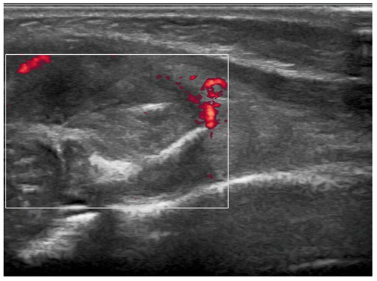 Preoperative ultrasound imaging of right elbow: soft tissue lesion on the anterolateral surface of the right forearm characterized by a nonhomogeneous echotexture and hyperechogenic spots and thin hyperechogenic lamella in its context. Intralesional vascularization is minimal. The surface of the cortex of the proximal radial metaphysis facing the mass is irregular. There is no evidence of chondro-epiphyseal detachment.