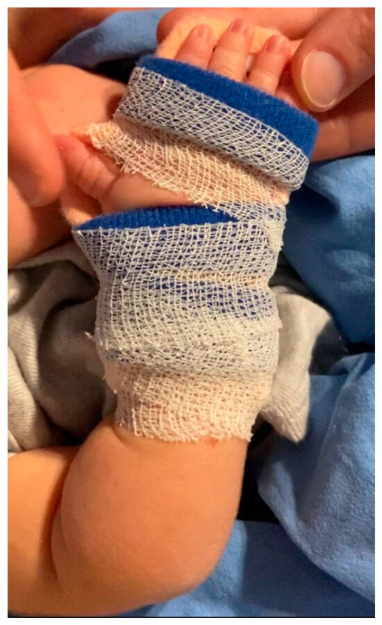 Isolated radial nerve palsy is characterized by the loss of extension of the wrist, thumb, and metacarpophalangeal joints, but preservation of the external rotation of the shoulder and elbow movement. Among causes of neonatal radial nerve palsy (NRNP), we mention prolonged intrauterine compression, constriction band, septic arthritis of the shoulder, humerus fractures, infantile cortical hyperostosis (Caffey disease), and prolonged application of arm cuff for blood pressure measurement [5,6,7] (Table S1). The most frequent mechanism is intrauterine compression, presenting with ecchymosis, erythema, and ulceration on the posterior surface of the arm [6,7].