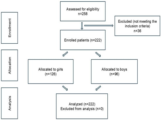 The flow of participants through the study is summarized in Figure 1. A total of 258 students were assessed for eligibility based on the inclusion and exclusion criteria. Out of these, 36 students were excluded for pre-existing musculoskeletal conditions (12 students), inability to complete the questionnaire (10 students), and lack of informed or parental consent (14 students). Following these exclusions, a total of 222 students were enrolled in the study, comprising 126 girls and 96 boys. Data from all 222 participants were successfully collected and included in the analysis, with no exclusions during the analysis phase. The complete inclusion of all enrolled participants in the analysis ensures that the results accurately reflect the study population.